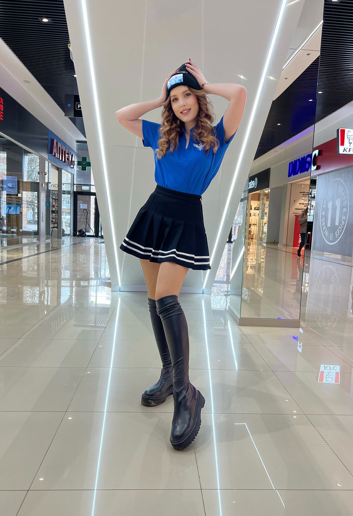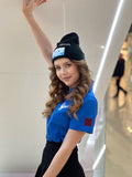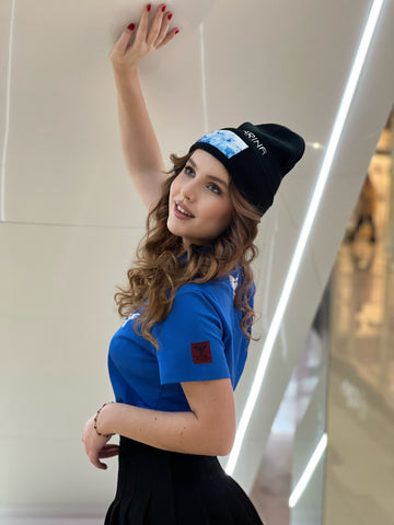 Czarina Sasha (@sashastarynets) is wearing a Black Beanie with blue sky design and white embroidered CZARINA from Czar Clothing