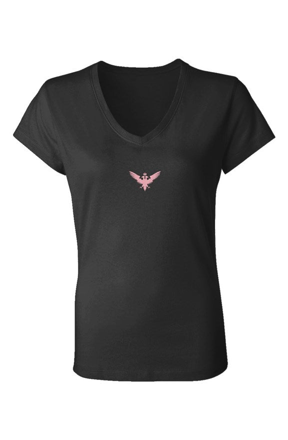 Ladies Black V-Neck T-Shirt with pink and white embroidery