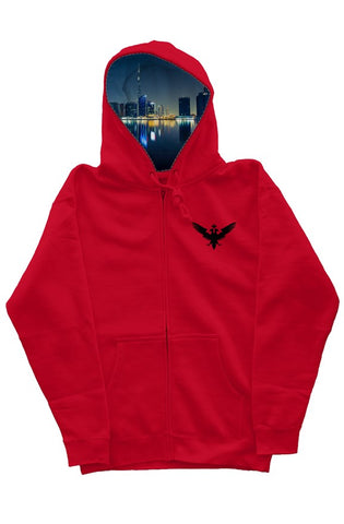 This Red heavy weight hoodie has unique Dubai Skyline hoodie liner, embroidered in three places including: black embroidered double headed eagle on the front left, on the right sleeve "BUILD YOUR EMPIRE" is Embroidered, on the back a print design with BUILD YOUR EMPIRE and a BLACK Double Headed Eagle Design. It is great for colder climates, longer durability, or any audience that prefers a heavy weight material. This Independent Zip Heavyweight Hoodie is created with premium heavyweight fabric with a quality construction and a generous fit. Premium ring-spun cotton is what this garment is composed of complete with a fleece lined hood.